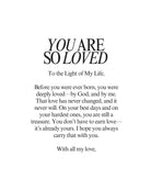 This set of 12 heartfelt 8x10 letters is written from the voice of a parent to a child—reminding them every month that they are loved, valued, and never alone. Each letter is filled with encouragement, faith, and gentle wisdom, designed to be displayed in your Forever Frame where your child can see it daily.